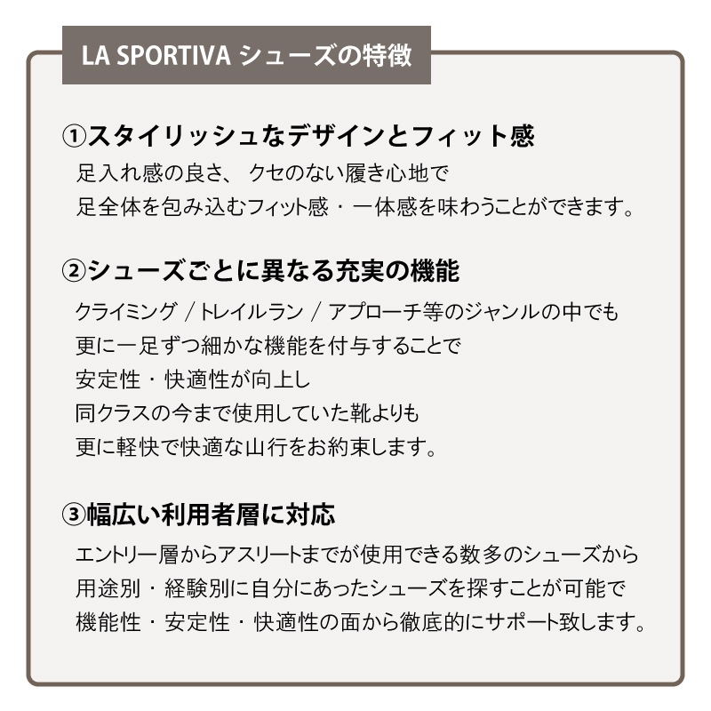 「動きやすさ」「安全」「軽快さ」の登山靴の基本機能を高次元で実現しています。いままでも常識に囚われない発想で世の中にないカテゴリを最も生み出しているのもLa Sportiva(スポルティバ)といえます。
