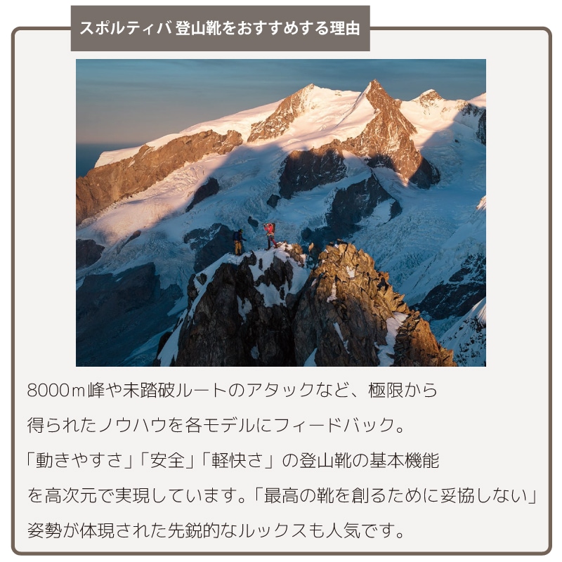 La Sportiva ( スポルティバ ) はこれまでも8000m峰や未踏破ルートのアタックなど、極限から得られたノウハウを各モデルにフィードバック。