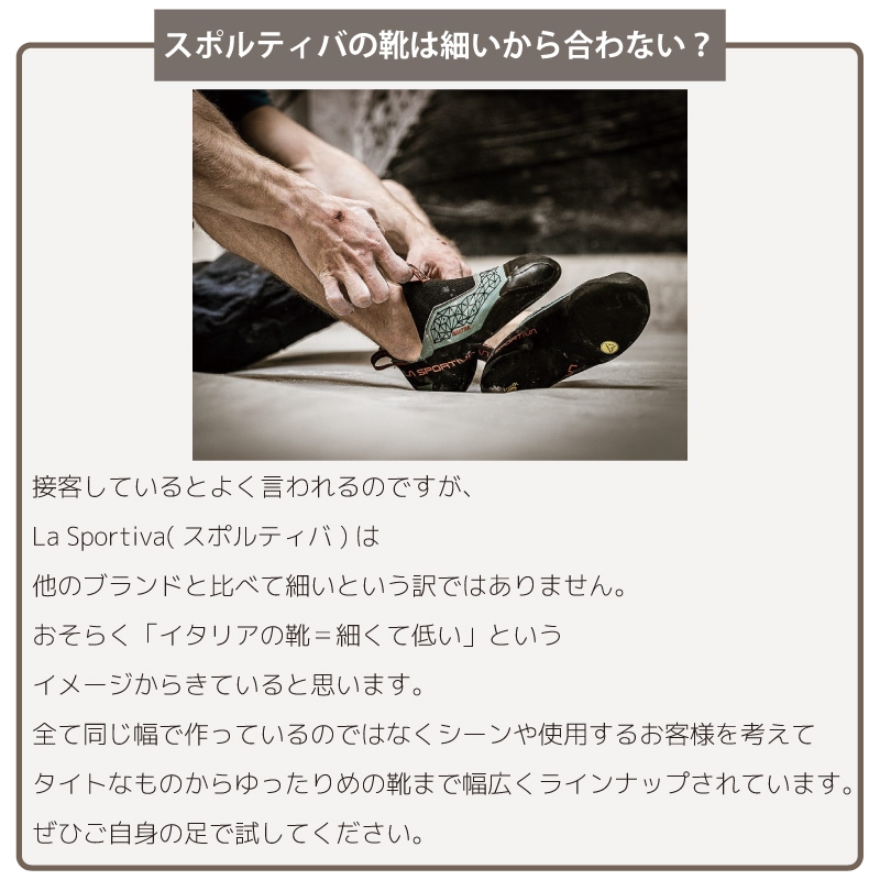 接客しているとよく言われるのですが、La Sportiva(スポルティバ)は他のブランドと比べて細いという訳ではありません。